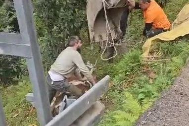 Rize’nin Çamlıhemşin ilçesinde yoldan aşağıya yuvarlanan inek bulunduğu yerden vinçle kurtarıldı.