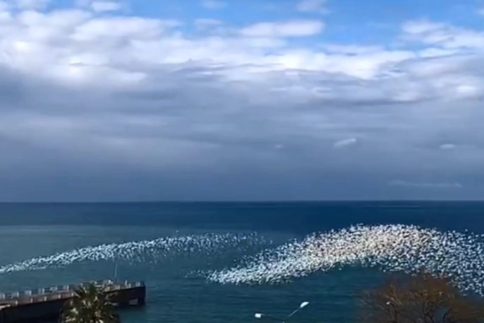Hopa ilçesinde kıyıdaki hamsi sürüsünü denizin hemen üzerinde takip eden yüzlerce martının uçarken sergiledikleri uyumlu hareketler, izleyenleri mest etti. Kıyıya yakın bölgede toplanan martılar, denizin dalgalanmasını andıran ahenkli hareketlerle beyaz bir dalga görüntüsü oluştururken, bu anlar Merve Numanoğlu'nun cep telefonu kamerasına yansıdı. Kısa sürede sosyal medyada paylaşılan görüntüler, büyük ilgi gördü.