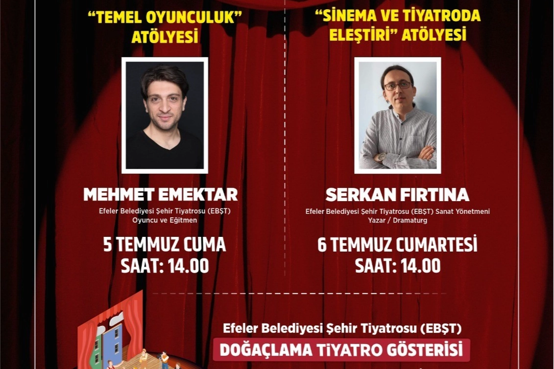 Efeler Belediyesi Şehir Tiyatrosu oyuncusu ve eğitmen Mehmet Emektar, 5 Temmuz Cuma günü saat 14.00’te “Temel Oyunculuk Atölyesi” gerçekleştirecek. EBŞT’nin sanat yönetmeni, dramaturg ve yazar Serkan Fırtına ise 6 Temmuz Cumartesi günü saat 14.00’te 'Sinema ve Tiyatroda Eleştiri Atölyesi' düzenleyecek. Ayrıca, EBŞT ekibi 6 Temmuz Cumartesi günü saat 22.00’de doğaçlama tiyatro oyunu sahneleyecek.