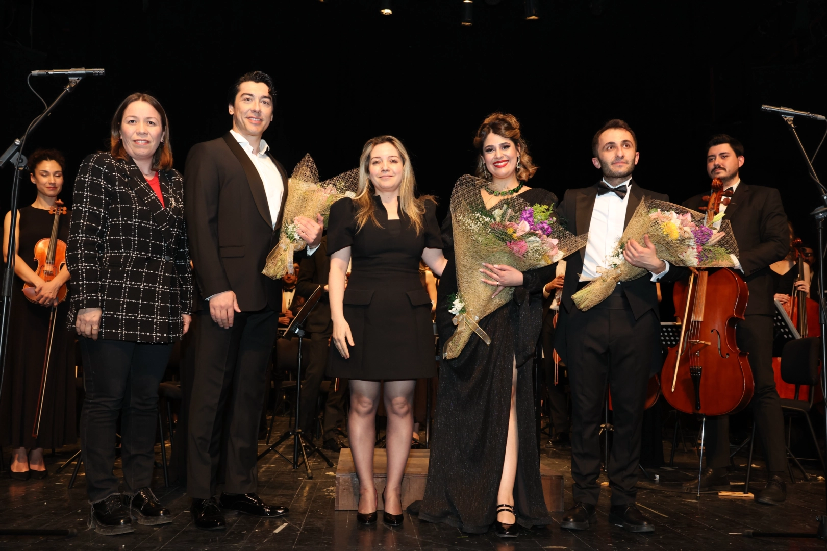 Konserin ardından Özlem Akbaş Önsoy, şef Deniz Tan ile solistler Yasemin Ek ve Uğur Atasoy’a teşekkür ederek hediye takdim etti.