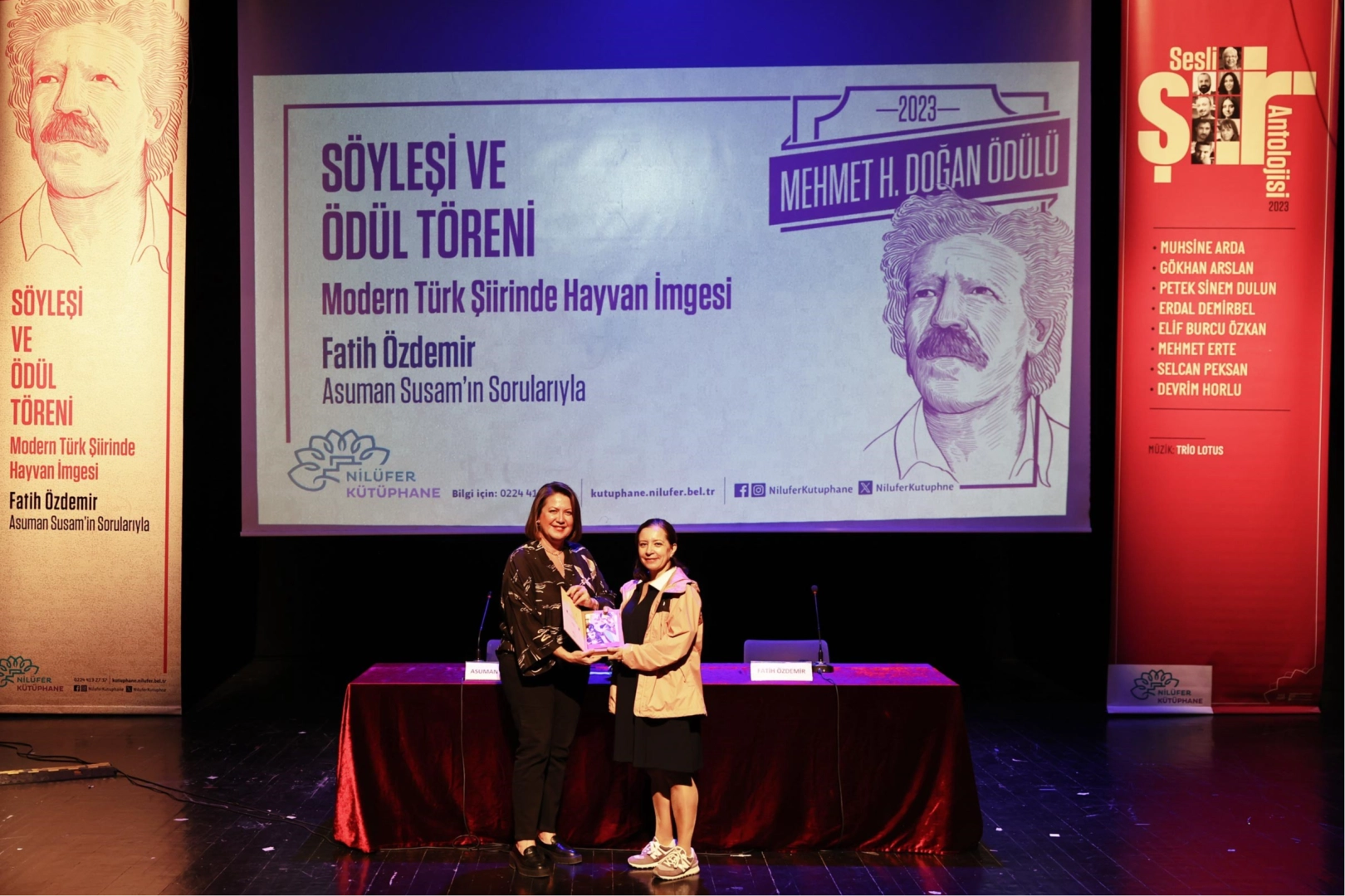 rak bırakmak adına düzenlenen Sesli Şiir Antolojisi’nde okunan şiirlerin kayıtlarının, Şiir Kütüphanesi’ndeki yerini alacağını söyledi. Nilüfer Belediye Başkanı Turgay Erdem, konuşmasının ardından Fatih Özdemir’e Mehmet H. Doğan Ödülü’nü verdi. Nilüfer Belediyesi Kütüphane Müdürü Şafak Baba Pala da, yarışmanın seçici kurul üyesi Asuman Susam’a katkılarından dolayı teşekkür etti. Törenin ardından Asuman Susam’ın sorularıyla gerçekleşen söyleşide Fatih Özdemir, “Modern Türk Şiirinde Hayvan İmgesi” kitabı üzerine açıklamalarda bulundu.