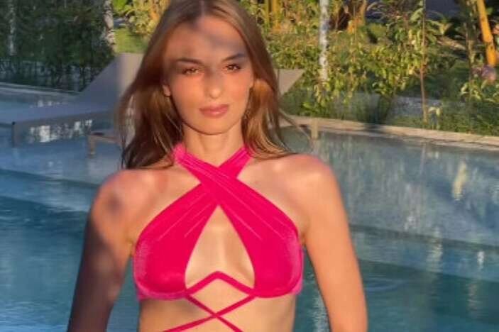Yayınladığı paylaşıma "Sade plaj kombinim ne bakıyorsun" yazan Şahinkaya, birbirinden değişik hareketleriyle sosyal medyada gündem oldu.
