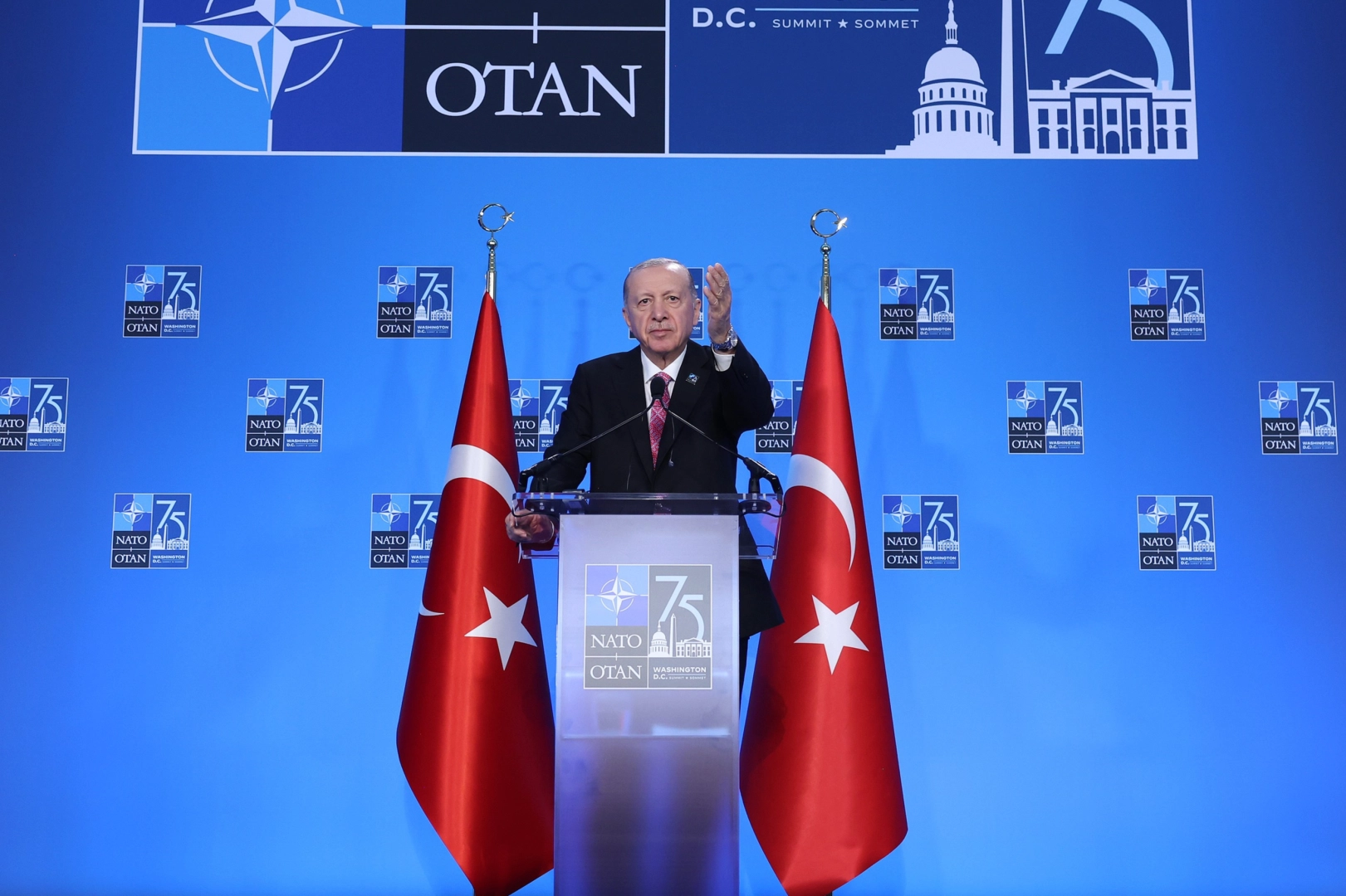 Cumhurbaşkanı Recep Tayyip Erdoğan, ABD'nin başkenti Washington'daki Walter E. Convention Center'da gerçekleştirilen NATO Devlet ve Hükümet Başkanları Zirvesi'nin ardından düzenlediği basın toplantısında, Filistinlilerin, kendi bağımsız devletlerine sahip olma hakları teslim edilmeden, kalıcı bir barışın tesis edilemeyeceğinin altını çizdi.