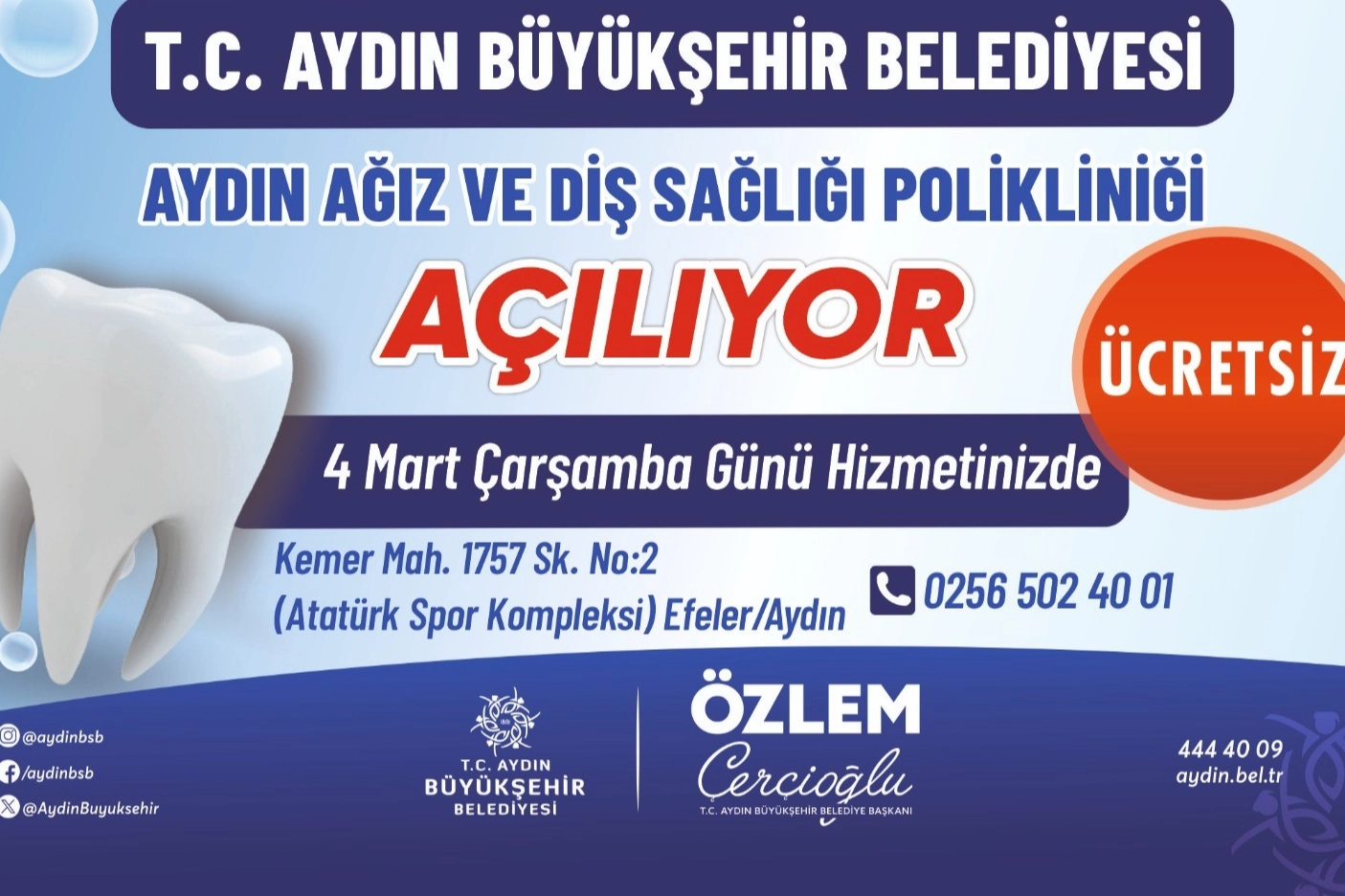 Aydın Büyükşehir Belediye Başkanı Özlem Çerçioğlu’nun kente kazandırdığı sağlık yatırımlarına bir yenisi daha ekleniyor. Ağız ve Diş Sağlığı Polikliniği, Nazilli’nin ardından Aydın’ın merkezde de hizmete açılıyor. Aydın Büyükşehir Belediyesi tarafından tamamen ücretsiz olarak hizmet verecek olan Aydın Ağız ve Diş Sağlığı Polikliniği, kentte yaşayan vatandaşların ağız ve diş sağlığı hizmetlerine hızlı ve kolay şekilde ulaşmasını sağlayacak. Nazilli’de kısa sürede büyük ilgi gören merkez; modern mimarisi, güçlü teknik altyapısı, vatandaşların ihtiyaçları gözetilerek planlanan yapısı, çağdaş tıbbi donanımı ve uzman sağlık personelleriyle Aydın’ın merkezinde de vatandaşlara hizmet verecek. Aydın’ın tüm ilçelerinde yatırımların devam edeceğini belirten Aydın Büyükşehir Belediye Başkanı Özlem Çerçioğlu, "Aydınımızın dört bir yanında vatandaşlarımızı yatırımlarımız ve hizmetlerimiz ile buluşturmaya devam ediyoruz. Nazilli ilçemizin ardından Aydın’ın merkezinde de Ağız ve Diş Sağlığı Polikliniği’ni hizmete açıyoruz. 4 Mart Çarşamba gününden itibaren hizmete başlayacak bu projemizin de kentimize hayırlı olmasını diliyorum. Aydınımız için çalışmaya, projelerimizi hemşehrilerimiz ile buluşturmaya devam edeceğiz. Hizmetle büyüyen Aydın" ifadelerini kullandı. Kemer Mahallesi 1757 Sokak'ta, Atatürk Spor Kompleksi’nde 4 Mart Çarşamba gününden itibaren hizmete başlayacak olan Aydın Ağız ve Diş Sağlığı Polikliniği ile ilgili detaylı bilgi ve randevu almak isteyen vatandaşlar, 0256 502 40 01 numaralı telefon üzerinden iletişime geçebilecek.