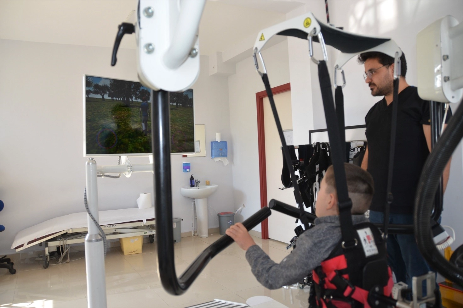 Her çocuğun motor seviyesine uygun ve bir üst seviyeye taşıyacak uygun egzersiz programları oluşturduklarını ifade eden Uzm. Dr. Bilgi, sözlerini şu şekilde sürdürdü: “Hastanemizde iki adet robotik yürüme cihazı ve bir adet de omuz kol robotunun bulunuyor.
