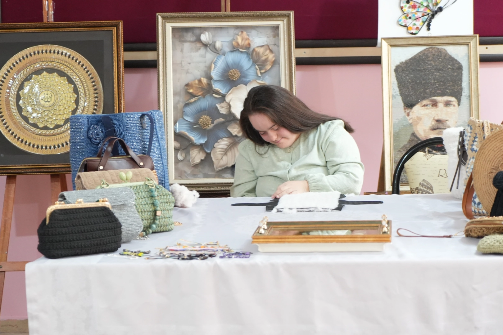 Muş'ta takı tasarım kursuna katılan down sendromlu Rabia Nur Güngör'ün mozaik tabloları ve el emeği çantaları büyük ilgi görüyor. Rabia Nur, kristal mozaikten hazırladığı Atatürk posterini Tarkan'a hediye etmek istiyor. Muş Halk Eğitim Merkezi Müdürlüğü'nde düzenlenen takı tasarım kursuna katılan down sendromlu Rabia Nur Güngör, ortaya koyduğu el emeği ürünlerle takdir topluyor. Sanatla sosyal hayata aktif olarak katılan Güngör'ün çalışmaları yoğun ilgi görüyor. Meslek lisesi mezunu olan 24 yaşındaki Rabia Nur Güngör, kurs süresince çanta, mozaik tablo ve rölyef çalışmalar üretti. Özellikle kristal mozaikten hazırladığı Atatürk portresi en çok ilgisini çeken eserler arasında yer alan Rabia Nur, azmi ve başarısıyla örnek oluyor. Mozaik Atatürk posterini Tarkan'a hediye etmek istiyor Rabia Nur Güngör'ün çalışmaları, verilen kursların bireylerin sosyal uyumu, özgüveni ve üretkenliği üzerindeki olumlu etkisini bir kez daha ortaya koydu. Evde vakit geçirmek yerine kursa gelmeyi tercih ettiğini dile getiren Güngör, hayranı olduğu sanatçı Tarkan'a yaptığı mozaik Atatürk posterini hediye etmeyi çok istediğini belirterek, "Ben meslek lisesi mezunuyum. Evde canım sıkılıyor, bu yüzden kursa geliyorum. Mozaik tablolar yapıyorum, Atatürk tablosu hazırlıyorum. Ben Tarkan hayranıyım. Yaptığım mozaik posteri Tarkan'a hediye etmek istiyorum. Sesim Tarkan kadar güzel. Burada çanta ve mozaik yapıyorum" dedi. Rabia'nın ablası Klinik Psikolog Merve Nur Güngör de, sanatın bireysel gelişim ve psikolojik iyilik hali üzerindeki etkisini göz önünde bulundurarak bu süreci başlattıklarını ifade ederek, "Kız kardeşim 2023 yılında meslek lisesinden mezun oldu. Rabia'da evde kalmaktan kaynaklı bir stres ortaya çıktı. Mezun olan özel çocuklarımız evde kaldıkları zaman gerçekten hiçbir hedefleri olmuyor. Saçları dökülmeye bile başlamıştı. Aynı dönemde emekli olan annem de bir yeğenini kaybetmişti, zor bir yaz süreci geçiriyorduk. Ben bir klinik psikolog olarak sanatın insanların ruh sağlığı üzerindeki faydasını biliyorum. Bu nedenle Rabia için Halk Eğitim Merkezi'ndeki kurslara başvuralım istedim. Sağ olsun hocamız da bizi kabul etti. Gerçekten Rabia'nın bu kadar yetenekli olduğunu biz ailesi olarak 24 yıldır bilmiyorduk. O kadar güzel çalışmalar yaptı ki hepimiz hayran kaldık. Çok güzel tablolar ve çantalar üretti. Ürettiği çantayı ne zaman taksam herkes ‘Nereden aldınız? Nereden yaptırdınız?' diye soruyor. Hatta siparişler bile almaya başladık" şeklinde konuştu. Psikolog Güngör, kursta diğer kadınların da üretim sayesinde ekonomik ve psikolojik destek bulduğunu belirterek, "Burada ben, bir klinik psikolog olarak birçok kadının hayatına tanıklık etme imkânı buldum. Ev ekonomisine katkı sağlamak isteyen; psikolojik ve mental olarak kendini iyi hissetmeyip burada şifa bulan birçok kadının hikâyesine tanıklık ettik. En önemlisi de şu anda aylık olarak 10-15 bin lira kazanabilen kadınlarımız var. Burada üretiyoruz ve ürettiğimiz ürünleri pazarlama ve satma imkânı da buluyoruz. İnşallah haziran ayında bu çalışmaların yer alacağı güzel bir sergi de planlıyoruz" ifadelerini kullandı. Güngör, kursun sosyal yönüne de değinerek, "Bütün Muş halkını sanat eserlerimizle buluşmaya davet ediyoruz. Burası sadece Rabia için değil, kadınlar için de gerçekten çok güzel bir umut oldu. Burada çok güzel bir frekans yakaladık. Hem bir şeyler üretiyoruz hem de sohbet ediyor, dertleşiyoruz. Adeta bir grup terapisi gibi oldu. Hatta planlarım arasında bir sanat terapi atölyesi kurmak da var. Bu süreci kitaplarda da yer verecek şekilde anlatmak istiyoruz. Burada bir aile gibi olduk. Hocamızın ve halk eğitiminin önderliğinde Muş'ta çok güzel projelere imza atmayı çok istiyoruz" şeklinde konuştu. Takı tasarım kursunda usta öğretici olarak görev yapan Sümeyya Aydın ise, kursun sadece takı tasarımıyla sınırlı olmadığını, farklı alanlarda da üretim yapıldığını belirterek, "Takı tasarımının dışında rölyef tablolar, kristal mozaik tablolar, çantalar olmak üzere birçok alanda öğrencilerimle ürünler ortaya koyuyoruz. Genellikle onların yönelmek istedikleri alanlara göre eğitim veriyorum. Rabia ilk olarak annesiyle birlikte kursumuza geldi ve burayı merak etti. İlk geldiğinde çantalarla başladık. Çok güzel çantalar üretmeye başladı. Daha sonra kristal mozaik çalışmalarına yöneldik. Bazen rölyef çalışmalarında da bize yardımcı oluyor. Çalışmalarını tamamlayamadığında birlikte destek olup bitiriyoruz. Aynı zamanda şarkılar söylüyor, sınıfın neşesi; herkes onu çok seviyor. Birçok öğrencim Rabia için kursa geliyor. Bizim için çok değerli bir öğrenci. Asıl amacımız, Rabia'nın ürettiği bu eserleri satabilmesi ve hem kendisine hem de ailesine katkı sağlayabilmesi. Rabia kristal mozaikten çok güzel bir Atatürk portresi yaptı. Kendisi Tarkan hayranı ve bu çalışmasını Tarkan'a iletip hediye etmek istiyor. Bizim amacımız, kadın girişimcilerin ve öğrencilerimizin emeğinin görünür olmasını sağlamak, ev ekonomilerine katkı sunmalarına destek olmak. Rabia'nın da yaptığı bu eserlerin satılmasını istiyoruz" diye konuştu.