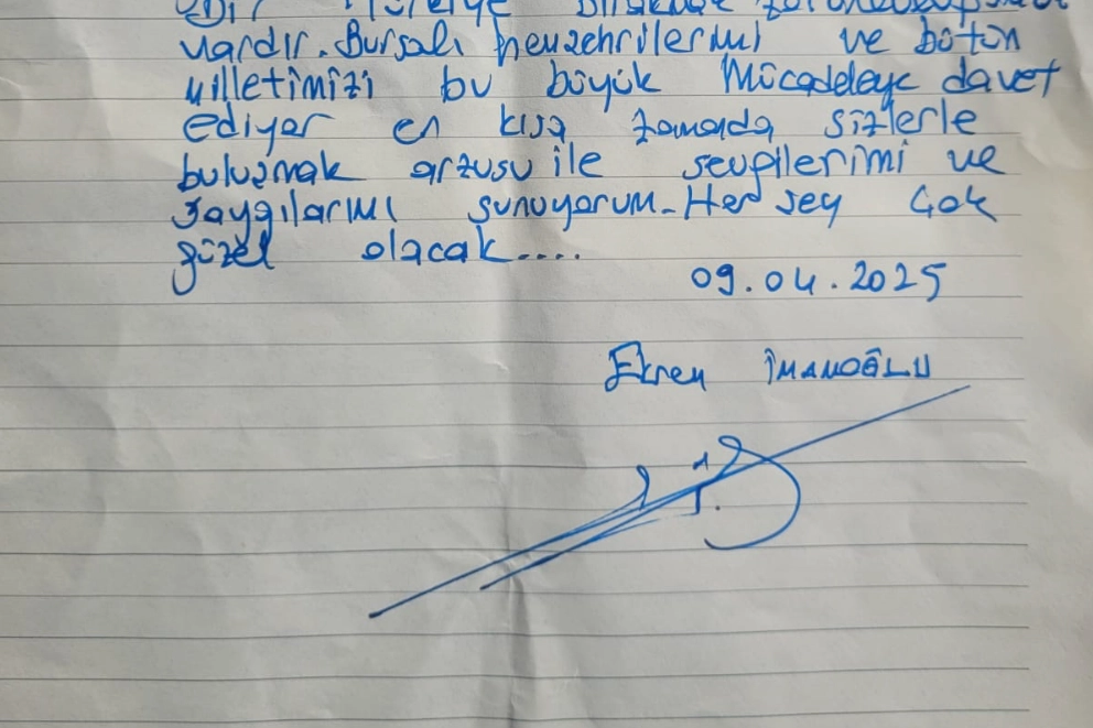 İstanbul Büyükşehir Belediye Başkanı Ekrem İmamoğlu’nun mektubunu, Cumhuriyet Halk Partisi (CHP) Bursa İl Başkanı Nihat Yeşiltaş ve Bursa Büyükşehir Belediye Başkanı Mustafa Bozbey, Silivri Cezaevi’nde gerçekleştirdikleri ziyaret sırasında teslim aldı. Ziyaretin ardından, CHP Bursa İl Başkanı Nihat Yeşiltaş, Ekrem İmamoğlu’nun moralinin yüksek olduğunu ve azminin halkın iktidarı ve özgürlük mücadelesinde önemli bir umut kaynağı sunduğunu belirtti.