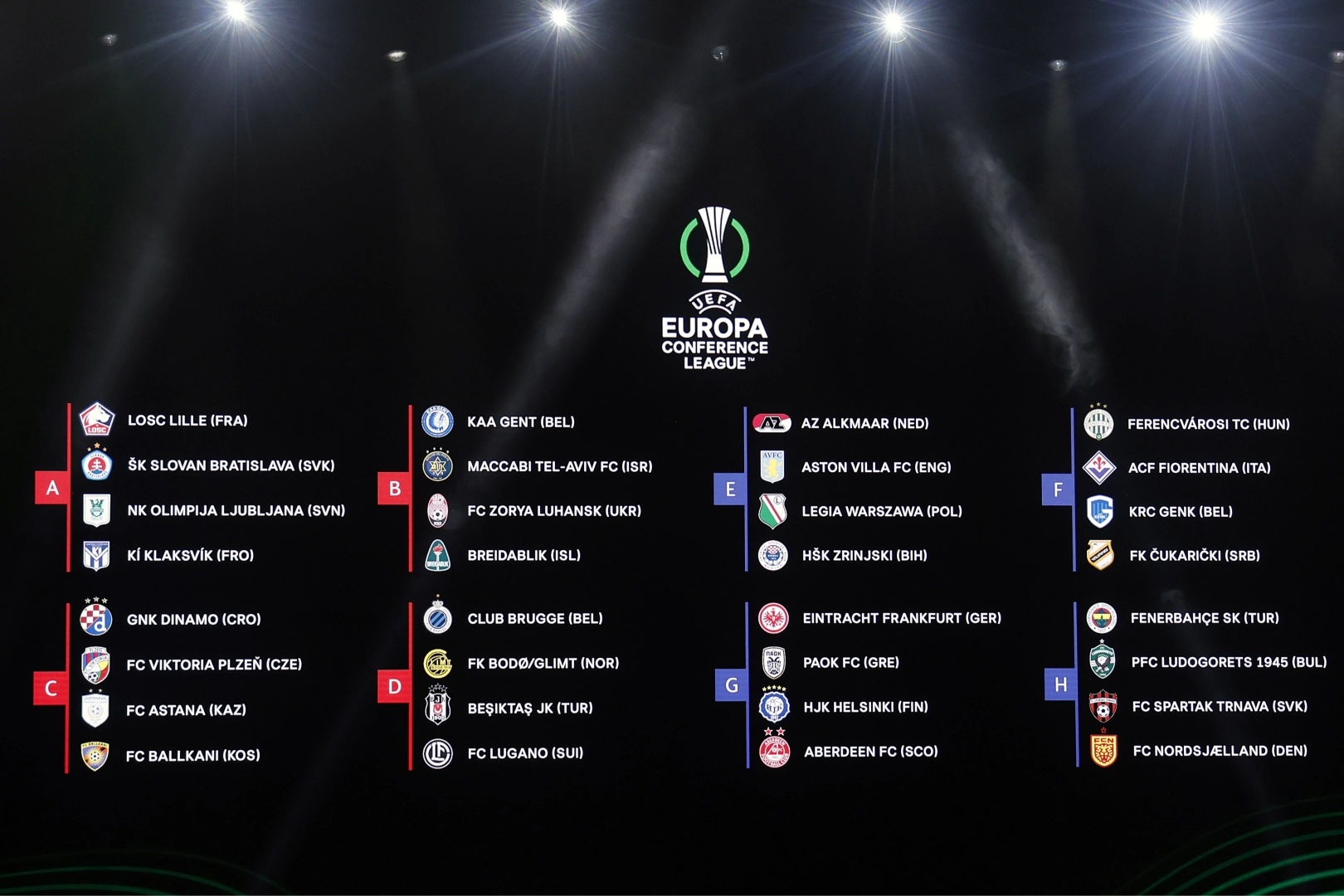UEFA Avrupa Konferans Ligi’nde Fenerbahçe H Grubu’nda Ludogorets, Spartak Trnava ve Nordsjaelland ile, Beşiktaş da D Grubu'nda Club Brugge, Bodo Glimt ve FC Lugano ile eşleşti. Türkiye’den Fenerbahçe ve Beşiktaş’ın da yer aldığı UEFA Avrupa Konferans Ligi’nde grup kuraları Fransa’nın Monaco şehrinde yer alan Grimaldi Forum Ticaret Merkezi’nde çekildi. Kura çekimi, eski futbolcular Mark Noble ve Traianos Dellas tarafından yapıldı. Kura çekimi sonucunda 1. torbada yer alan Fenerbahçe, H Grubu’nda Bulgaristan'ın son şampiyonu Ludogorets, Slovakya temsilcisi Spartak Trnava ve Danimarka ekibi Nordsjaelland ile eşleşti. 3. torbadan kura çekimine katılan Beşiktaş da, D Grubu'nda Belçika takımı Club Brugge, Norveç temsilcisi Bodo Glimt ve İsviçre ekibi FC Lugano ile aynı grupta yer aldı. Avrupa Konferans Ligi’nde yer alan 32 takım, çekilen kura sonucu dörderli şekilde 8 gruba dağıldı. Turnuva kapsamında grup birincileri doğrudan üst tura yükselecek. Grubunu ikinci sırada bitirenler ise, UEFA Avrupa Ligi’nde grubunu 3. sırada tamamlayıp gelen takımlarla son 16 turuna kalmak için play-offta karşılaşacak. Turnuvada grup maçları 21 Eylül’de başlayacak ve 14 Aralık'ta sona erecek. UEFA Avrupa Konferans Ligi’nin finali ise 29 Mayıs’ta Yunanistan’ın başkenti Atina’da oynanacak. UEFA Avrupa Konferans Ligi’nde gruplar şu şekilde oluştu: A Grubu LOSC Lille Slovan Bratislava Olimpija Ljubljana Klaksvik B Grubu Gent Maccabi Tel-Aviv Zorya Luhansk Breidablik C Grubu GNK Dinamo Zagreb Viktoria Plzen Astana FC Ballkani D Grubu Club Brugge Bodo Glimt Beşiktaş FC Lugano E Grubu AZ Alkmaar Aston Villa Legia Varşova HSK Zrinjski F Grubu Ferencvaros Fiorentina Genk Cukaricki G Grubu Eintracht Frankfurt PAOK HJK Helsinki Aberdeen H Grubu Fenerbahçe Ludogorets Spartak Trnava Nordsjaelland