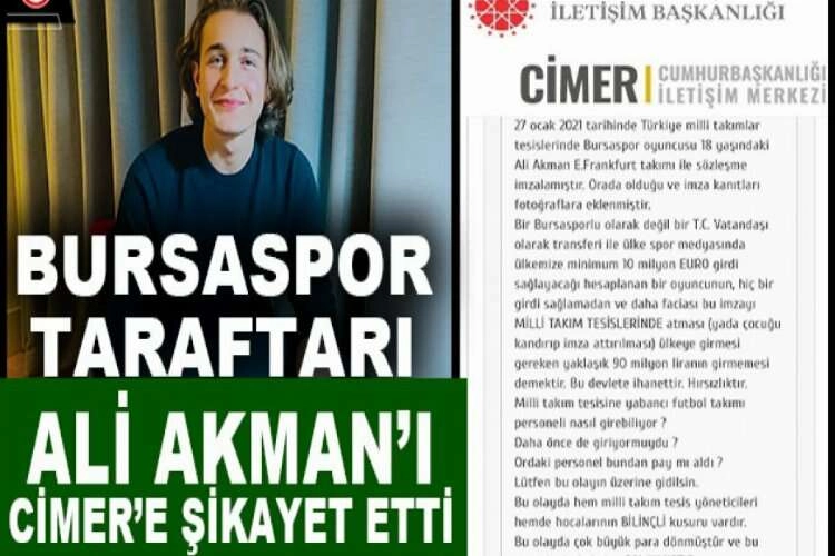 TFF 1.Lig ekiplerinden Bursaspor’da Ali Akman konusu kapanmıyor. 18 yaşındaki futbolcunun Eintracht Frankfurt’a bedelsiz şekilde transferi olması ve bunu ilk etapta gizlemesi gündem oluşturdu. Anlaşmaya göre sezon sonuna kadar formasını giyeceği Bursaspor’da da kadro dışı kalan Ali Akman’a bir şok da taraftardan geldi. Yeşil-beyazlı bir taraftar, genç golcüyü Cumhurbaşkanlığı İletişim Merkezi’ne şikayet etti. Taraftarın Cimer’e gönderdiği mesaj şu şekilde: “27 ocak 2021 tarihinde Türkiye Milli Takımlar Tesisleri’nde Bursaspor oyuncusu 18 yaşındaki Ali Akman, E.Frankfurt takımı ile sözleşme imzalamıştır. Orada olduğu ve imza kanıtları fotoğraflara eklenmiştir. Bir Bursasporlu olarak değil bir T.C. Vatandaşı olarak transferi ile ülke spor medyasında ülkemize minimum 10 milyon Euro girdi sağlayacağı hesaplanan bir oyuncunun, hiç bir girdi sağlamadan ve daha faciası bu imzayı Milli Takım Tesisleri’nde atması (ya da çocuğu kandırıp imza attırılması) ülkeye girmesi gereken yaklaşık 90 milyon liranın girmemesi demektir. Bu devlete ihanettir. Hırsızlıktır. Milli takım tesisine yabancı futbol takımı personeli nasıl girebiliyor? Daha önce de giriyor muydu? Oradaki personel bundan pay mı aldı? Lütfen bu olayın üzerine gidilsin. Bu olayda hem milli takım tesis yöneticileri hem de hocalarının bilinçli kusuru vardır. Bu olayda çok büyük para dönmüştür ve bu para devletimizden çalınmıştır.”
