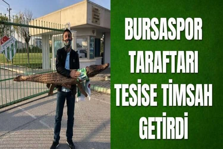 TFF 1. Lig ekiplerinden Bursaspor, Eskişehirspor maçı hazırlıklarına devam ederken, tesislerin dışında ilginç bir görüntü dikkat çekti. Yeşil-beyazlı bir taraftar, Sudan’dan aldığı doldurulmuş gerçek bir timsaha atkı takarak, Özlüce İbrahim Yazıcı Tesisleri’nin yolunu tuttu. Pandemi sebebiyle içeriye alınmayan taraftar, Bursaspor’un simgesi olan timsahı ve yeşil-beyazlı takıma olan sevgisini şu sözlerle anlattı '14 aydır Sudan’dayım. Bursaspor’umu çok özledim. Ziyarete geldim. Ama pandemiden dolayı giremedim. Bursasporlu olduğum için gurur duyuyorum. Böyle bir timsah buldum. Benim arkadaşım. Gerçektir. Doldurulmuş timsah derisidir. İsmim Murat, kendimi bildim bileli Bursasporluyum.' Yeşil-beyaz sevdalısının Sudan’dan satın aldığı içi doldurulmuş timsahın, derisini, dişlerini ve kollarını görenler şaşkınlıklarını gizleyemedi.