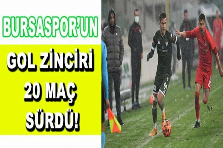 TFF 1. Lig’in 21’inci hafta maçında Bursaspor sahasında Tuzlaspor’la 0-0 berabere kaldı. Bu skor, yeşil-beyazlı takımın 20 maçlık gol zincirini de koparmış oldu. Bursaspor sadece kendi liginde değil Türkiye’deki tüm liglerde her maçta gol atan tek takım olma unvanını da kaybetmiş oldu. Yeşil-beyazlılar, 20 haftalık dilimde rakip ağları 35 kez sarsmıştı. Bursaspor ligde en çok golü ise 8’inci haftada Boluspor’u 4-2 mağlup ettiği karşılaşmada kaydetmişti. Yeşil-beyazlı takım, gol atamadığı tek takım olan Tuzlaspor ağlarını deplasmanda 3 kez havalandırmıştı.