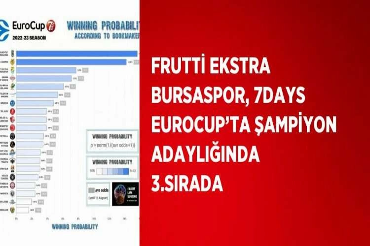7DAYS EuroCup organizasyonunda Türkiye’yi 2022-2023 sezonunda temsil edecek Frutti Extra Bursaspor, 20 takım içinde şampiyonluk adaylığında 3. sırada gösterildi.Ciddi bir çekişmeye sahne olması beklenen 7DAYS EuroCup için favorilerini belirleyen bahis siteleri, geçen sezon final oynama başarısı gösteren ve şampiyonluğu kıl payı kaçıran Frutti Extra Bursaspor’u, 2022-2023 sezonunun şampiyon adaylığında 3. sıraya koydular. Yeni sezona girerken gelen bu haber, Koç Alimpijevic’in öğrencileri için motivasyon kaynağı olurken, Frutti Extra Bursaspor taraftarlarında da heyecanı tetikledi.