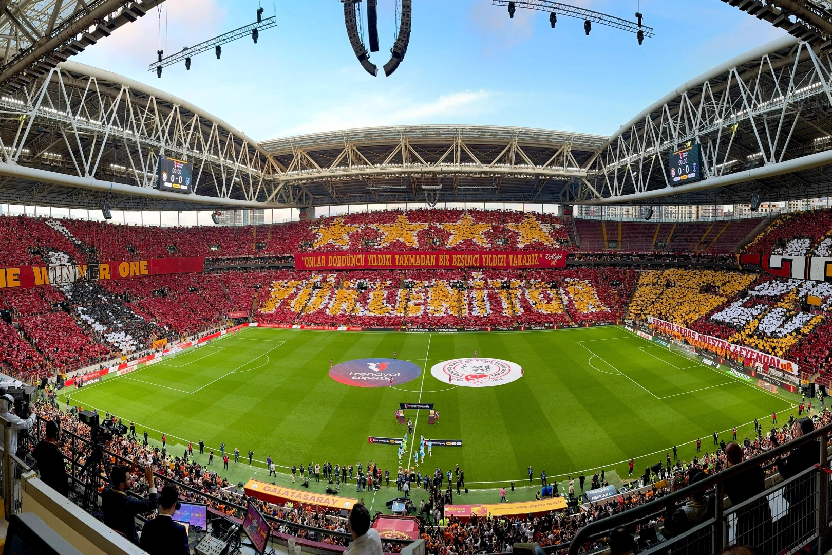 Doğu tribününde önce kartonlarla '4 yıldız' ve 'Yükleniyor' yazılarak, Fenerbahçe'ye gönderme yapılırken, daha sonra ise kartonlar 'İlk ve tek' ile '5 yıldız' yazısına çevrildi ve Galatasaray Başkanı Dursun Özbek'in 2017 yılında söylediği 'Onlar dördüncü yıldızı takmadan biz beşinci yıldızı takarız' sözünün pankartı açıldı.