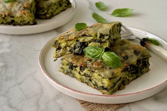 *Ispanakları yıkadıktan sonra ince doğrayarak büyük bir kaba aktarın. Üzerine beyaz peynir, krema, yumurtalar, baharatlar, karbonat ve kalan zeytinyağını ekleyerek ıspanaklar yumuşayana kadar elinizle yoğurun. Doğranmış yufkaları da ilave ederek iyice harmanlayıp yağlanmış fırın kabına aktarın ve üzerine hafifçe bastırarak düzeltin.