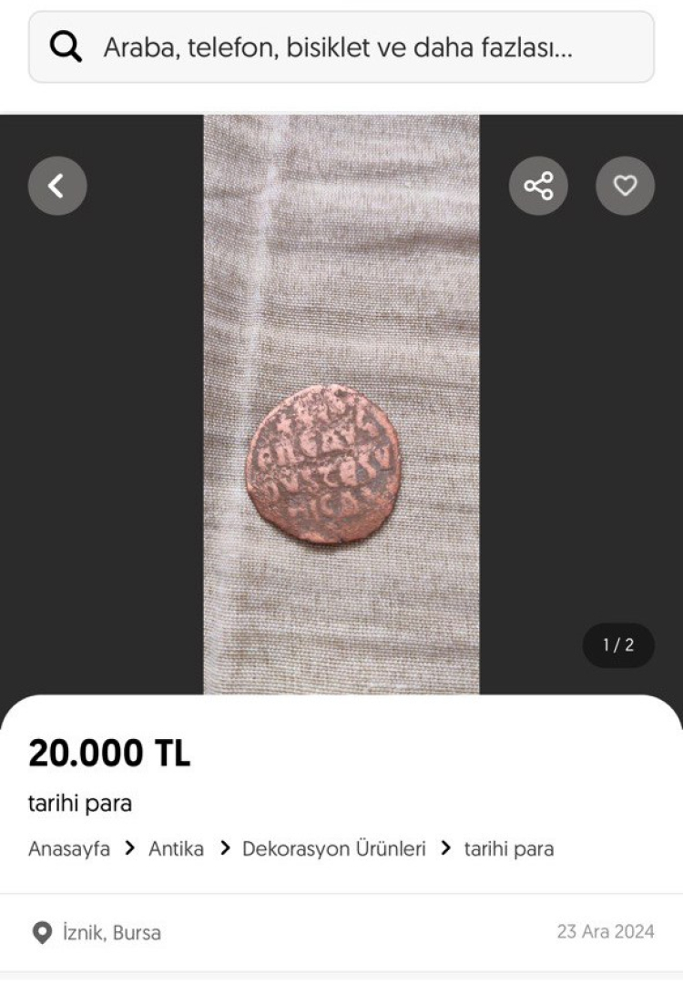 Bursa'da 4 medeniyete başkentlik yapmış dünyaca ünlü tarihi kent İznik'te internet üzerinden tarihi sikkelerin satışa sunulması herkesi şok etti. Bir alışveriş sitesinde tarihi kent İznik'ten çıkartıldığı iddia edilen 2 bin yıllık sikkelerin satışa sunulması dikkat çekti.