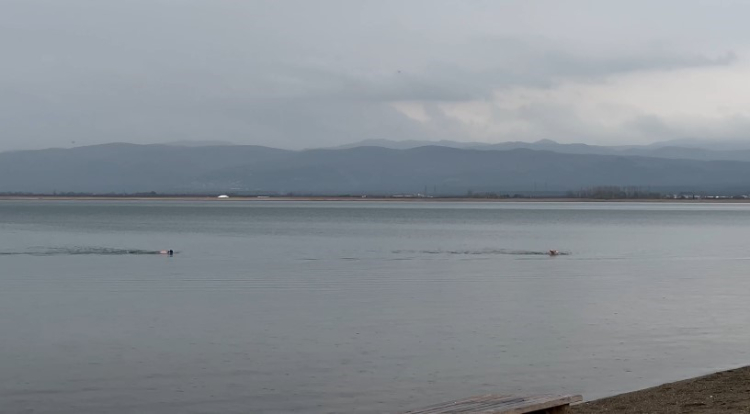 2025'in ilk günü buz gibi havaya aldırış etmeden gölde dakikalarca kalan grup İznik'li vatandaşları şaşırttı.