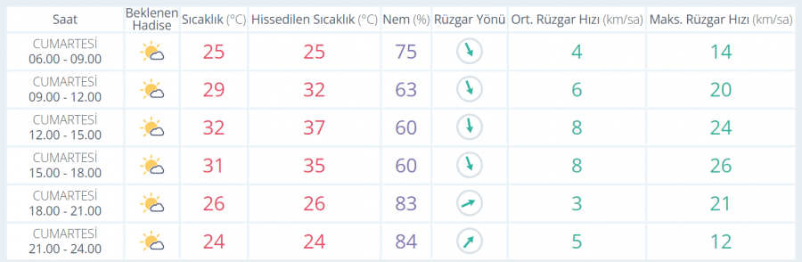 Akşam saatlerine doğru da termometreler 31 derece olarak ölçülürken az bulutlu gökyüzüyle birlikte gün batımı yaşanıyor. Akşam saatlerinde açık gökyüzü ile birlikte hava sıcaklığı 26 derece seviyeleriğonde ölçülüyor. Gece saatlerinde de termometreler 24 derece seviyelerinde.