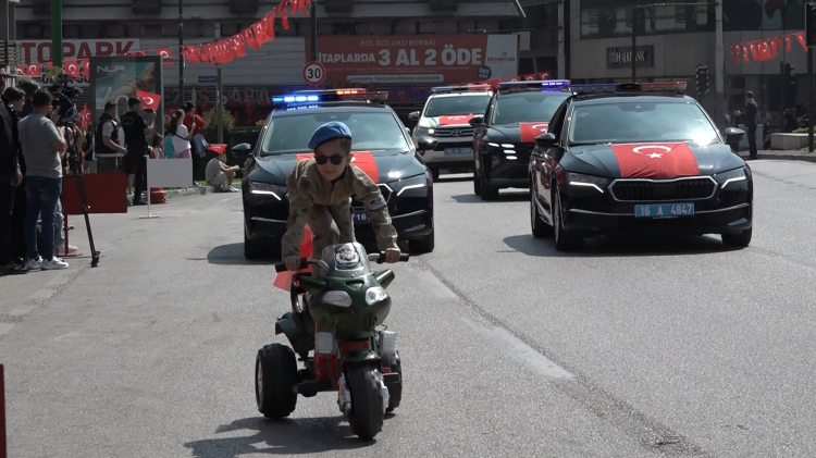 TOMA'dan atlı birliklere, köpekli ekiplerden jandarma helikopterine kadar resmi geçit herkesin göğsünü kabarttı. Törene damgasını vuran ise, akülü motoruyla askerlerin arasında geçide dahil olan çocuk oldu. Ayağa kalkarak protokolü selamlayan çocuk, vatandaşların büyük beğenisini kazandı.