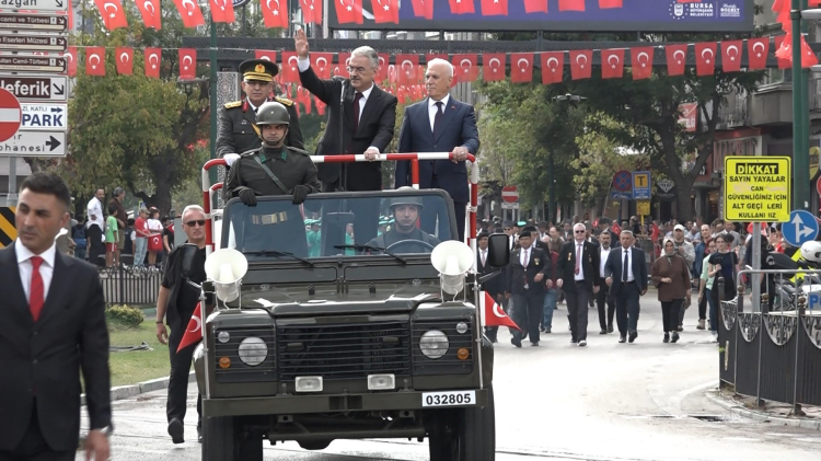 Ardından üstü açık araçla vatandaşların bayramını kutladı. Selamlama sonrası Osmangazi, Yıldırım, Nilüfer belediyeleri folklor ekipleri gösterilerini sundu. Program, günün anlam ve önemini anlatan konuşma ve şiirin ardından resmi geçitle devam etti.