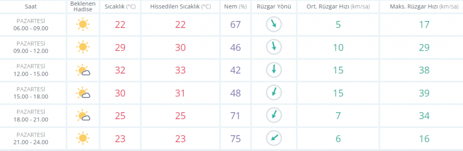 Akşam saatlerine doğru termometreler 30 derece olarak ölçülürken az bulutlu ve güneşli bir gökyüzüyle birlikte gün batımı yaşanıyor. Akşam saatlerinde de az bulutlu gökyüzüyle birlikte hava sıcaklığı 25 derece seviyelerinde ölçülüyor. Gecesaatlerinde de termometreler 23 derece seviyelerinde.