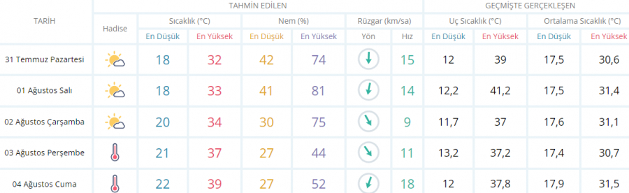 Haftanın dördüncü iş gününde (PERŞEMBR) yapılan tahminlere göre, sabah saatlerinde termometreler 21 derece olarak ölçülürken gün içerisinde açık ve bol güneşli gökyüzüyle birlikte Eyyam-ı Bahur sıcaklıkları etkili olmaya başlıyor ve termometreler 37 derecelere kadar yükseliyor.