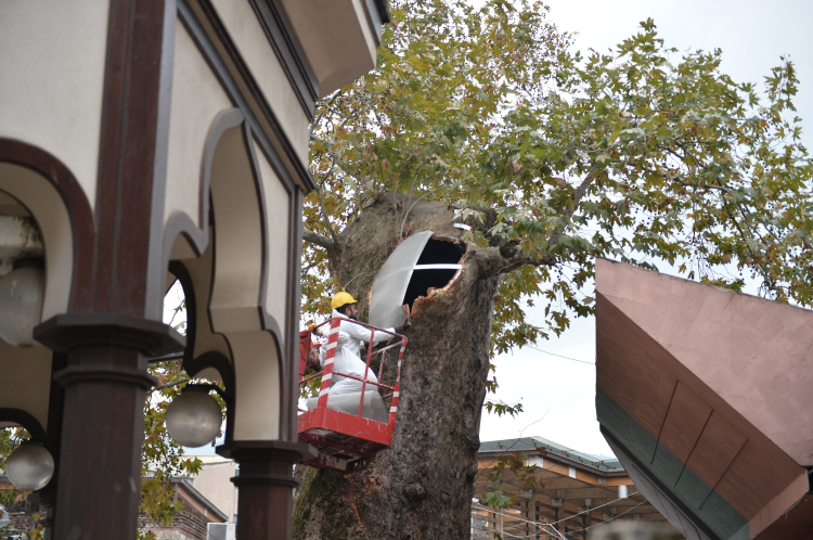 Park ve Bahçeler Dairesi Başkanlığı ekipleri tarafından yapılan incelemede, anıt ağacın açık yarasında çürümüş ve mantarlaşmış bölümler tespit edildi. Hızlı bir şekilde bakım ve restorasyon işlemlerine başlayan ekipler, özel ilaçlarla ‘çürümeye yol açan’ bakterileri temizledi. Ağacın iskeletine teller aracılığıyla destek uygulanırken, son aşamada özel yalıtım malzemesi kullanılarak ağacın açık yarası kapatıldı. Tedavi gören kısım boyanarak çınar ağacının formu yeniden düzenlendi.