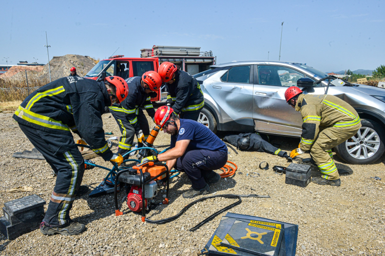 Küçükbalıklı'daki İtfaiye Eğitim Merkezi'nde yangına müdahale, arama kurtarma gibi çeşitli konularda uygulama yapılırken, senaryo gereği trafik kazası sonucu araç içinde sıkışan kazazedenin kurtarılması takibatı da gerçeği aratmadı.