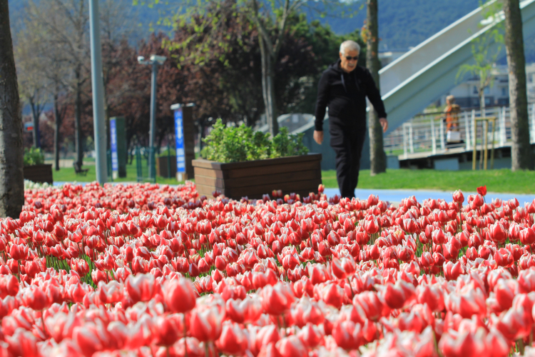 Özellikle Hüdevandigar Kent Parkı, geniş alanı ve açan rengarenk çiçekleriyle, içinden geçen Nilüfer Çayı'yla, Bursalılara stresten uzak farklı bir ortam sunuyor. Sabah saatlerinde yürüyüş için Kent Parkı'na gelenler laleler ve çiçeklerin sunduğu görsel şölen arasında yürüyor, adeta renklerin arasında kayboluyor.