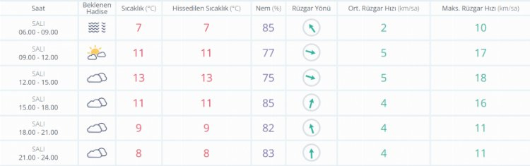 Ülkemiz genelinin parçalı ve çok bulutlu, Orta ve Doğu Karadeniz, Eskişehir dışında İç Anadolu bölge geneli, Batı Karadeniz'in doğusu, Orta ve Doğu Akdeniz, Doğu ve Güneydoğu Anadolu bölgeleri ile yarın (Salı) Kıyı Ege, Balıkesir'in batısı ve Çanakkale çevrelerinin yağışlı geçeceği tahmin ediliyor. Bu akşam saatlerinde Mersin, Adana, Bingöl, Diyarbakır ve Şanlıurfa'nın doğusunda yer kuvvetli olması beklenen yağışların genellikle yağmur ve sağanak, Orta Akdeniz'in Toroslar mevkii, Doğu Karadeniz'in iç kesimleri, Doğu Anadolu'nun kuzeydoğusu ve yüksek kesimlerinde yer yer karla karışık yağmur ve kar şeklinde olacağı tahmin ediliyor. Marmara'nın doğusu, İç Ege, İç Anadolu'nun batısı ve Batı Karadeniz'in iç kesimlerinde yer yer sis ve pus hadisesinin görülmesi bekleniyor.