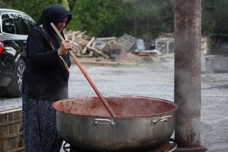 Bugün bu ziyaretimizde hanımefendilerin salça yapma etkinliklerine eşlik ettik. Saitabat Köy Kadınları Yardımlaşma Derneği, Türkiye'de köy kadınlarının dayanışması amacıyla kurulmuş ilk örnek. Kurulduğu ilk andan itibaren de tüm Türkiye'ye örnek çalışmalara imza atıyor. O kadar başarılı işlere imza atıyorlar ki ünleri Türkiye sınırlarını aşmış durumda. Yağmurlu bir hava altında arkadaşlarımız salçalarını üretiyorlar.