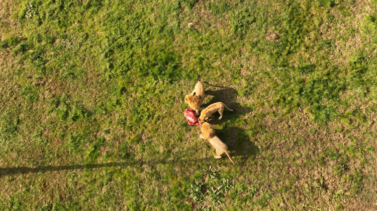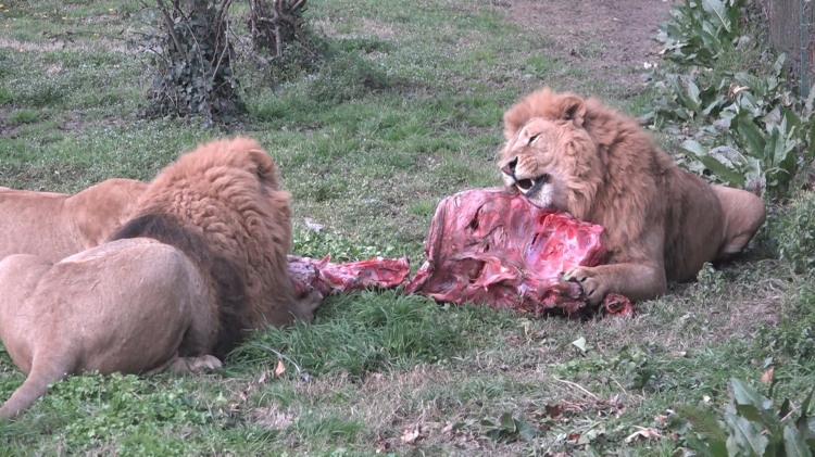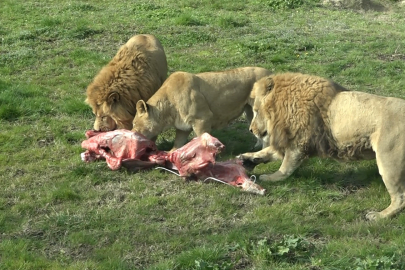 Vatandaşlar belgesellerde gördükleri aslanların beslenmelerini pür dikkat izlerken, onlar ise 75 kilo karkas eti afiyetle yedi.