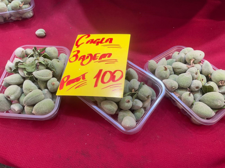Badem çağlasını pazarcı esnafına göre henüz kiloyla satın alan yok. Esnaf da bu yüzden 250'şer gramlık paketlerini 100 ila 150 lira arasında değişen fiyatlardan satıyor.
