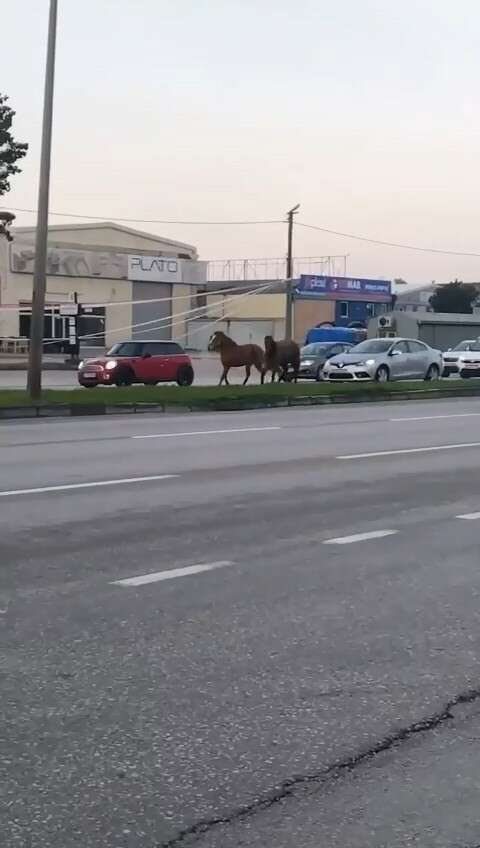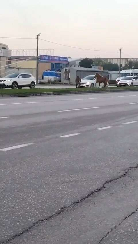 Sabah erken saatlerde refüjdeki yeşillik için yolun ortasına gelen 2 at, ilerleyen saatlerde trafik yoğunlaşınca ne yapacağını şaşırdı.