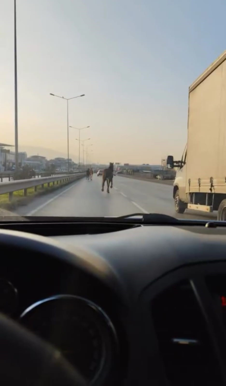 3 şeritli yolu işgal eden atlar trafiği tehlikeye düşürürken, kontrollü ilerleyen sürücüler kazaya karışmadı. Atların şeritleri işgal ettiği anlar kameraya yansırken, vatandaşlar kaza riskiyle karşı karşıya olduğunu belirterek yetkilerden yardım istedi. Bir süre anayolda ilerleyen atlar ise boş bir araziye girerek gözden kayboldu.