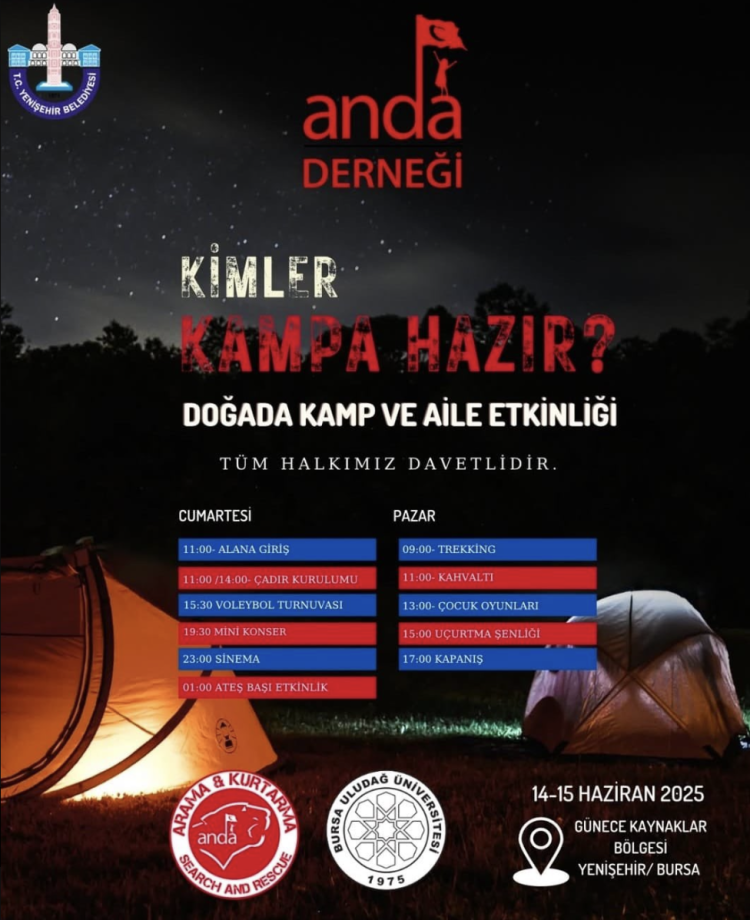 Yenişehir Belediyesi öncülüğünde, Anda Arama Kurtarma Derneği ve Uludağ Üniversitesi İbrahim Orhan Meslek Yüksekokulu öğrenci topluluğu iş birliğiyle hazırlanan kamp, 14-15 Haziran tarihlerinde Günece Kaynaklar Mevkii’nde gerçekleştirilecek.