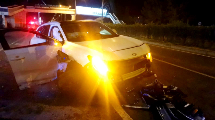 Bursa'nın Mudanya ilçesinde Togg marka otomobili ile tura çıkan Uğur Demirhisar (44), önüne çıkan köpeklere çarpmamak için manevra yaparken üst geçidin merdivenlerine çarptı.