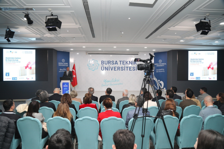 Bursa Teknik Üniversitesinde (BTÜ), Yönetim Akademisi Derneği iş birliği ile "Akademiden Sektöre: Bir Köprü Kurmak: Üniversite Sanayi İş Birliği" başlıklı sempozyum gerçekleştirildi. Mimar Sinan Yerleşkesi Turkuaz Salon'da yapılan etkinliğin açılışına; Bursa Büyükşehir Belediye Başkanı Mustafa Bozbey, BTÜ Rektörü Prof. Dr. Naci Çağlar, akademisyenler, sektör profesyonelleri, STK'lar ile öğrenciler katıldı. Programın açılış konuşmasını yapan Rektör Naci Çağlar, BTÜ'nün yalnızca bir eğitim kurumu değil, aynı zamanda bir inovasyon ekosistemi olduğunun altını çizdi. "Girişimcilik merkezlerimiz, yapay zekâ laboratuvarlarımız, sanayiye entegre uygulama programlarımız ve teknoparkımızla birlikte, sektörle omuz omuza ilerlemeye kararlıyız" diyen Rektör Çağlar, "Çünkü biliyoruz ki; bilgiye yön veren, geleceğe de yön verir. Bu bilinçle; akademik birikim ve Ar-Ge altyapımızı sektörlerle paylaşıyor böylece hem kurumlarımızı hem Bursamızı ve ülkemizi emin adımlara geleceğe taşıyacağımıza inanıyoruz" ifadelerini kullandı.