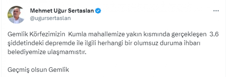 Sertaslan, "Gemlik Körfezimizin Kumla mahallemize yakın kısmında gerçekleşen 3.6 şiddetindeki depremde ile ilgili herhangi bir olumsuz duruma ihbarı belediyemize ulaşmamıştır" dedi.