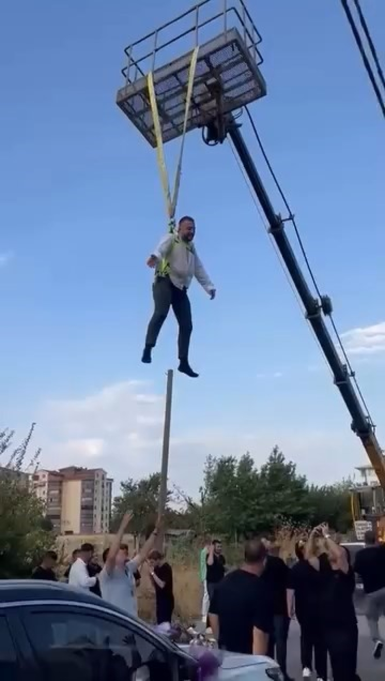Vinç ile havaya kaldırdıkları damadın altında arkadaşları göbek attı.