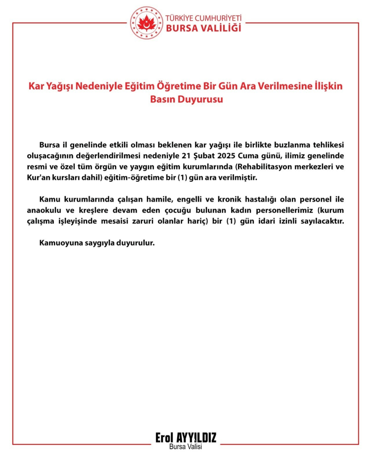 "Bursa il genelinde etkili olması beklenen kar yağışı ile birlikte buzlanma tehlikesi oluşacağının değerlendirilmesi nedeniyle 21 Şubat 2025 Cuma günü, ilimiz genelinde resmi ve özel tüm örgün ve yaygın eğitim kurumlarında (Rehabilitasyon merkezleri ve Kur'an kursları dahil) eğitim-öğretime bir 1 gün ara verilmiştir. Kamu kurumlarında çalışan hamile, engelli ve kronik hastalığı olan personel ile anaokulu ve kreşlere devam eden çocuğu bulunan kadın personellerimiz (kurum çalışma işleyişinde mesaisi zaruri olanlar hariç) bir 1 gün idari izinli sayılacaktır."