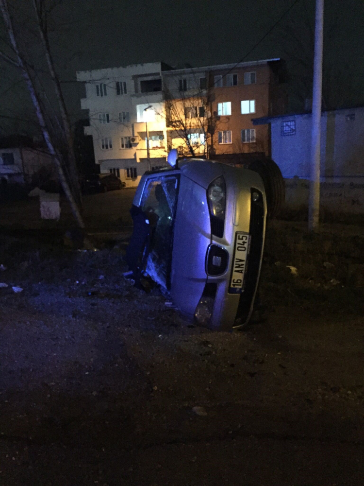 Kaza, merkez Yıldırım ilçesi Şirinevler Mahallesi 11 Eylül Bulvarı'nda meydana geldi. Edinilen bilgiye göre, Fikret O. idaresindeki 16 ANV plakalı otomobil, yağış sebebiyle kayganlaşan yolda sürücüsünün kontrolünden çıkarak takla attı. İhbar üzerine olay yerine polis ve sağlık ekipleri sevk edildi.