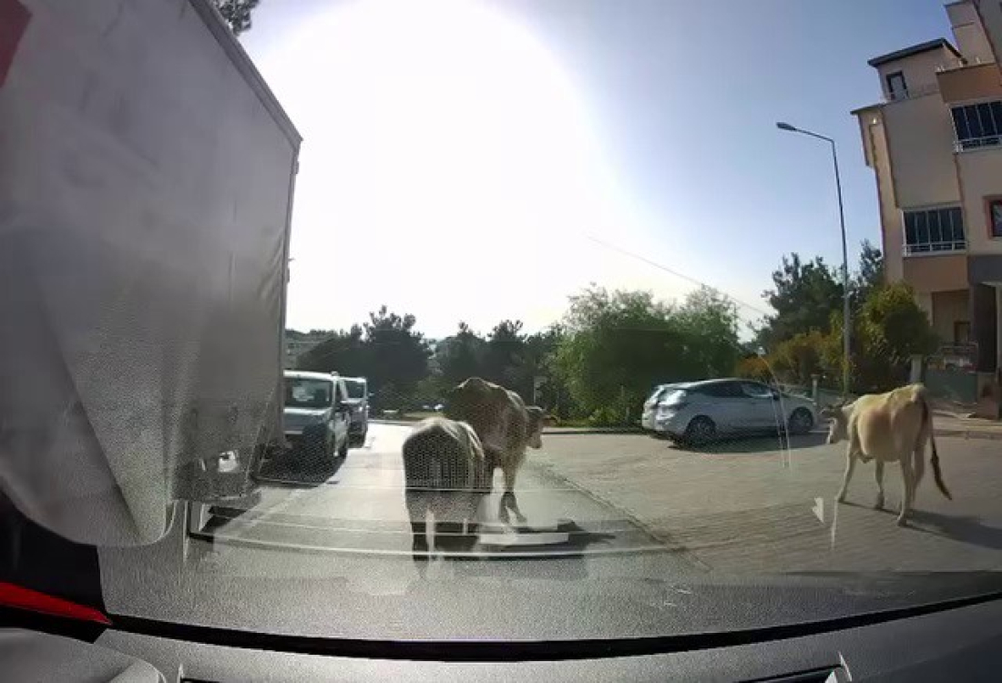 Sürücülerin korna ile ikazını duymayan danalar, bir süre cadde üzerinde ilerleyip daha sonra yol kenarındaki bir yeşil alana kaçıp uzun süre dinlendiler.