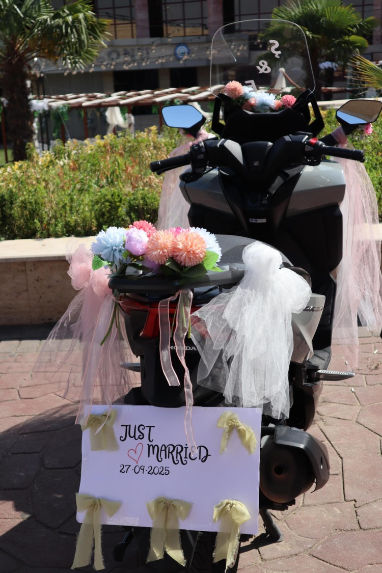 Nikâhın ardından motosikletlerini çiçek ve tüllerle süsleyen çift, düğün konvoyuna ilginç bir renk kattı.