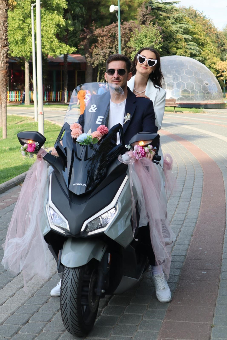 Genç çift, klasik gelin arabası yerine motosikletlerini süsleyerek konvoy yapıp şehir turu attı.