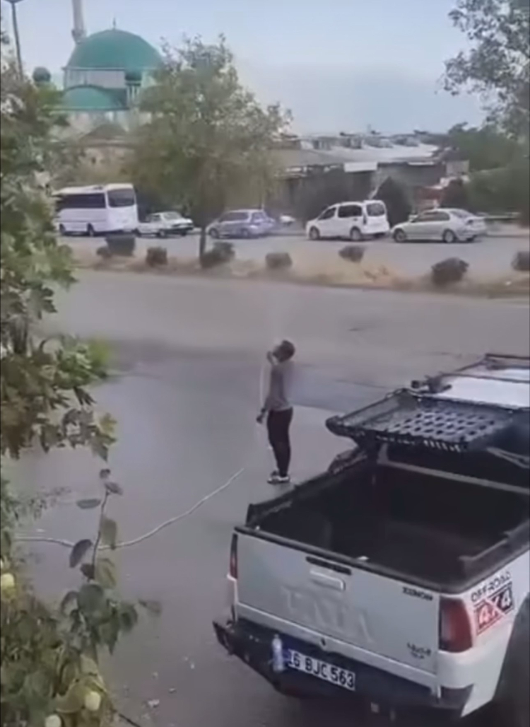 Bir vatandaşlar sıcaktan iyice bunalınca aldığı hortumla sokak ortasında kendisini serinletti. O anları arkadaşı ise gülerek kayda altı.