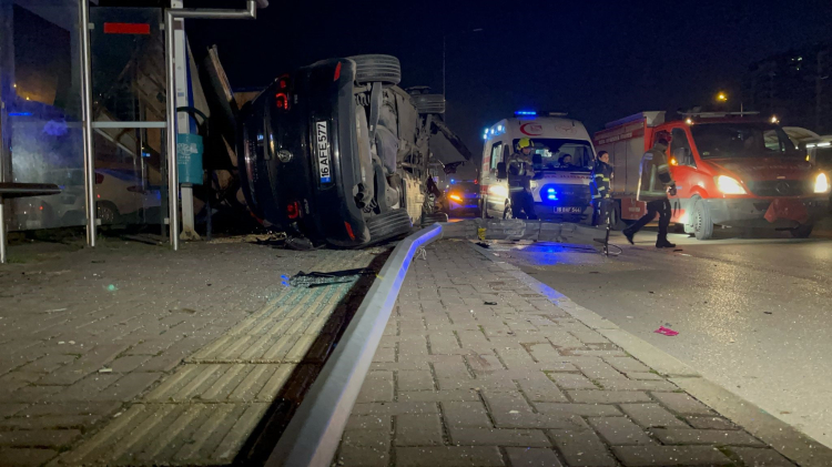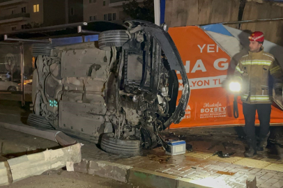Bursa'da sürücüsünün kontrolünden çıkan otomobil kaldırımda bulunan aydınlatma direğine ve reklam panolarına çarparak takla attı.