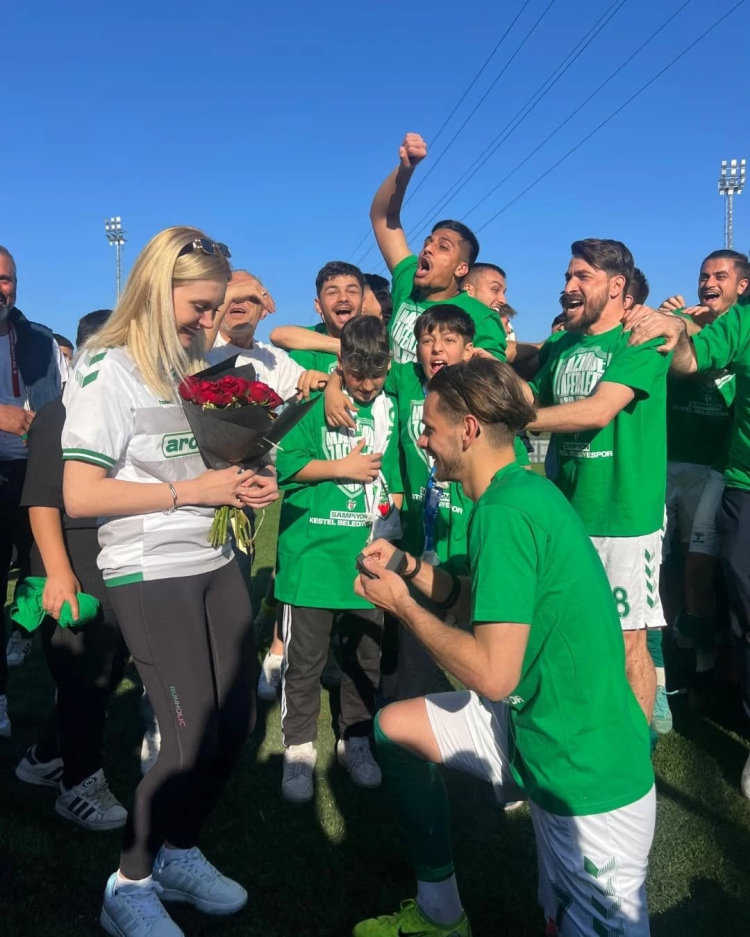 Kestel Belediyespor geçtiğimiz pazar günü Atıcılar Veysel Karani Sahası'nda oynanan Küplüpınar Yeşildağspor karşılaşmasını 3-0 kazanarak adını Bölgesel Amatör Lig'e (BAL) yazdırdı. Kestel Belediyespor forması giyen 24 yaşındaki tecrübeli kanat oyuncusu Hafız Görkem Vardar, maçın bitiminde kız arkadaşına sahada evlenme teklifinde bulundu. Evet cevabının ardından takım arkadaşları tarafından alkışlarla tebrik edilen genç çift, evlilik yolunda ilk adımı yeşil sahalarda atmış oldu.