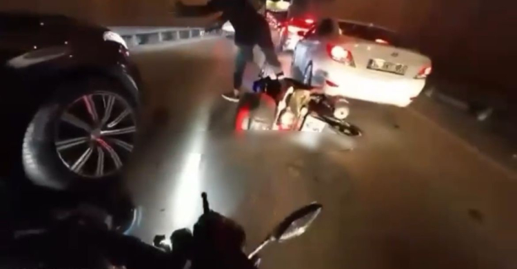 Ani frene basan sürücüye, arkadan gelen bir başka motosikletli çarptı. Kaza anı ise kask kamerasına anbean yansıdı.