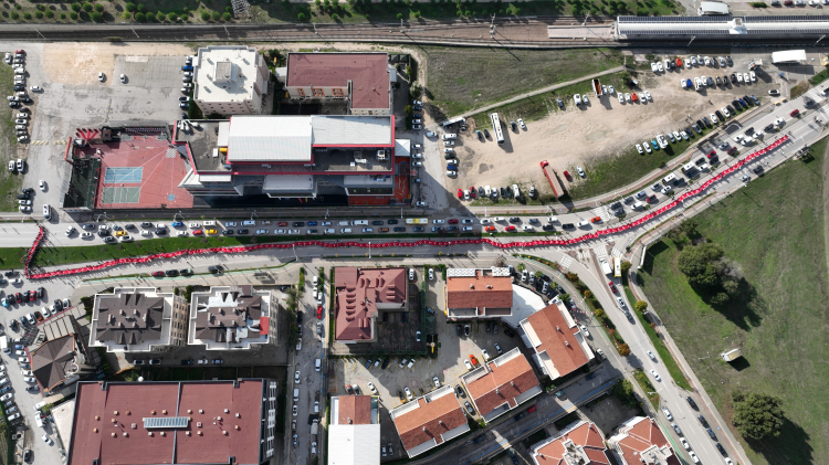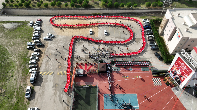 5 metro treni uzunluğundaki bayrak ile BURSARAY'ın yan yana geldiği anlar gökyüzünden drone ile görüntülendi. İki farklı bulvarı birleştiren bir cadde boyunca uzanan bayrağı yüzlerce öğrenci ellerinde taşıdı.