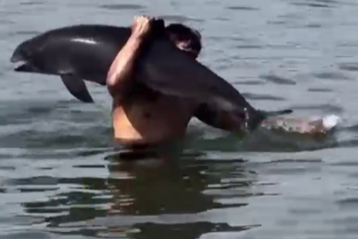 Bir vatandaş, ölmüş yunus balığını sırtında taşıyarak kenara getirdi. İlginç anlar, saniye saniye amatör kamera ile kaydedildi.